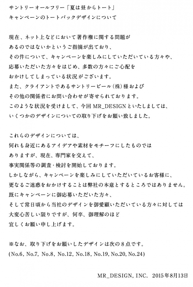 また、クライアントであるサントリービール(株)様およびその他の関係者にお問い合わせが寄せられております。このような状況を受けまして、今回MR_DESIGNといたしましては、いくつかのデザインについての取り下げをお願い致しました。これらのデザインについては、何れも身近にあるアイデアや素材をモチーフにしたものではありますが、現在、専門家を交えて、事実関係等の調査・検討を開始しております。