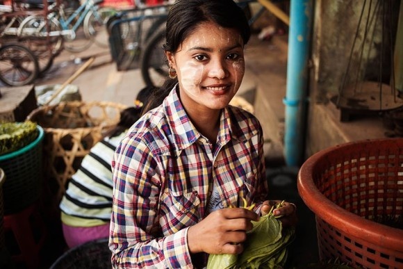 再びミャンマー。この国の人々とファッションセンスの別の面を見てみよう。この女性は、アメリカかカナダの家の中で着ているような、シンプルな格子柄のシャツを着ているが、目を引き、そそられるのは、顔の白いペイントと彼女の魅力的な笑顔だ。