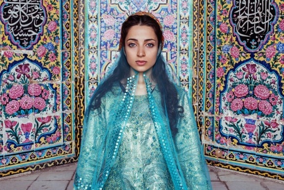 伝統的なタイルの壁の前に座るイラン女性。壁にはカラフルで複雑な模様が施されており、多くの人々にとっての国家の美をはっきり見せている。彼女のアクアマリンブルーのドレスと透けた薄衣が明るくすばらしい色合いの重要性を際立たせている。