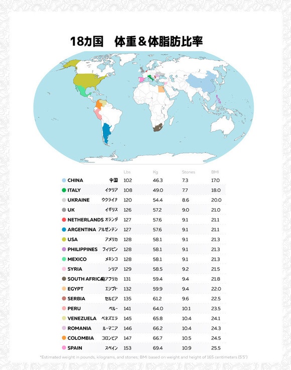 中国とイタリアが最も痩せ型で、推定体重はそれぞれ46.3kgと49.0kgである。最もふくよかなのはスペインで69.4kgだ。中国の推定BMIは17.0で、先述の通り拒食症レベルだ。