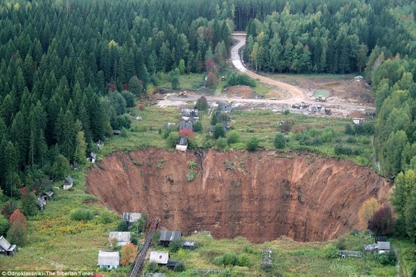 http://www.dailymail.co.uk/news/article-3223277/Holiday-homes-teeter-precariously-250ft-deep-sinkhole-caused-Russian-mines.html