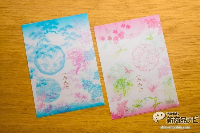 今回はクリアファイルということで、通常は金銀でしか楽しめなかった文様が桃色と空色にアレンジされてプリントされている。小技が利いていると思ったのは、裏面を白地にすることで文様がきれいに楽しめるところと、表面は透明でそちらにも文様が描かれており、重なることで完成するところ。