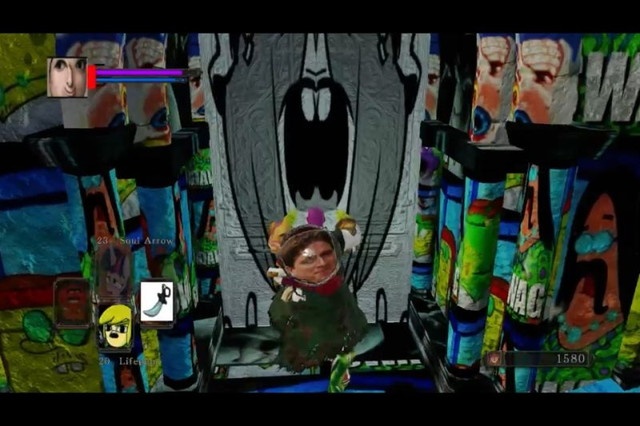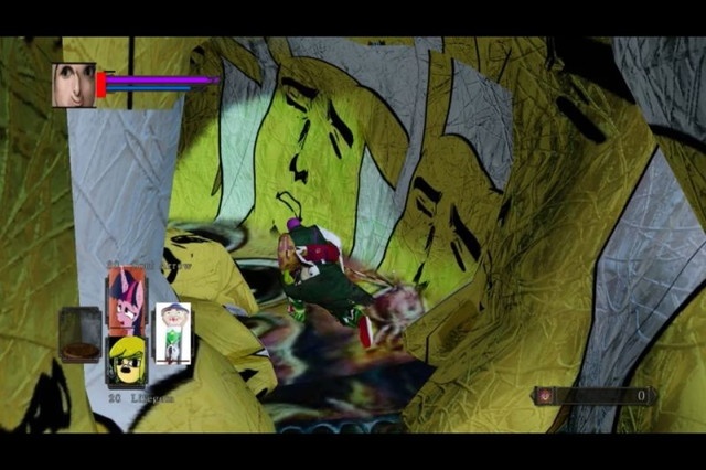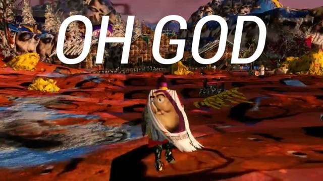 ありとあらゆるテクスチャーが、インターネットのミームから拝借してきたものに差し替わっているようです。地面にも空にも巨大な顔が貼り付けられています。