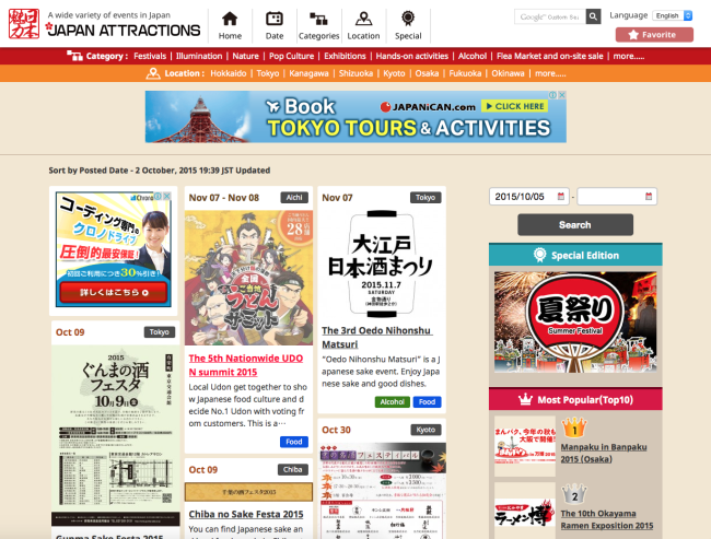 日本のイベント情報紹介サイト。カテゴリー、日付、場所で絞り込み検索ができます。