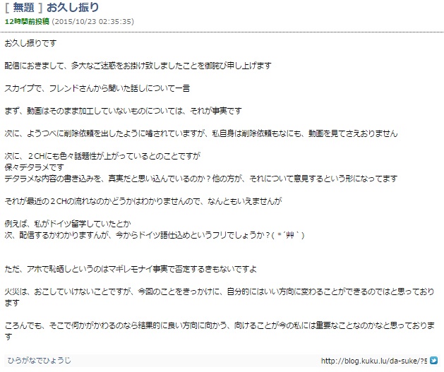 あの事件から数日、事件の当事者がはじめてブログを更新した。そのときの状況と動画が消えている真相についてが書かれている。