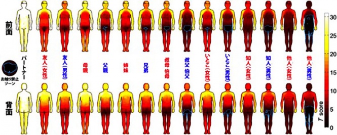 これは『友達の数は何人?』という書籍で有名なロビン・ダンバー博士の研究で、5つの国から男女1300名分にアンケートを行ったもの。全員に対して「どんな人にどこを触られたら嫌ですか?」といった質問をして、その回答をヒートマップにしたんですね。
