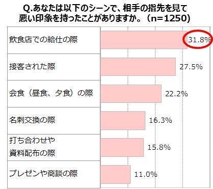 どのようなシーンで相手の指先を見て悪い印象を持った経験があるかを聞いたところ、1位が「飲食店での給仕の際」(31.8%)、2位が「接客をされた際」(27.5%)、3位が「会食の際」(22.2%)という結果になり、接客されている時や近距離の場合に、相手の指先が気になると回答した人が多かった。