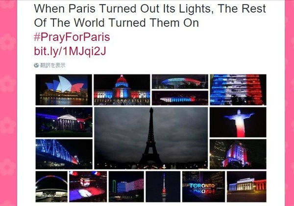 Women Daily Magazine (@womendailym) 2015, 11月 14 世界各国はフランス国旗に見立てた「青・白・赤」のライトで建物を照らした。これはフランス・パリに追悼の意を表すとともに、我々は仲間であるという意思表示のようにも感じる。現在ハッシュタグ「#PrayForParis」でこの状況が共有され、そのほかにもFacebookのアイコンを国旗色に染めるツールまでもが有る。もちろん、これでパリが救われるわけではないが、せめてもの勇気づけになるはずだ。