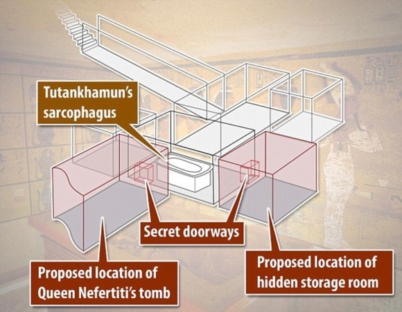 玄室の北壁のスキャンから、石膏の装飾の下に隠し扉らしきものがあることが判明した。ツタンカーメンの義母である王女ネフェルティティの玄室だと推測されている。