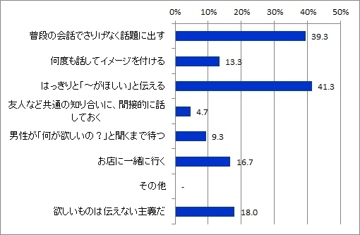 男性に対して、女性の欲しいものを探る方法について複数回答可でたずねたところ、全体では最も多かったのは「普段の会話でさりげなく聞き出す」の45.3%で、「『何が欲しいの?』とストレートに聞く」の34.7%が次点となった。年代別では、「普段の会話でさりげなく聞き出す」が各年代でほぼ同率だったのに対し、「『何が欲しいの?』とストレートに聞く」では、20代が28.0%、30代が32.0%だったが、40代では44.0%と大きく上回る結果となった。