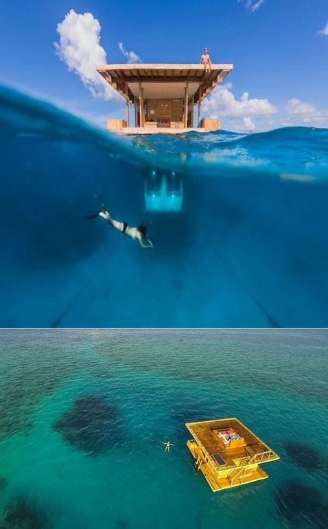 ここの呼び物は、なんといっても水中の部屋だ。3階建ての設備はサンゴ礁の中に浮いていて、主寝室は水中に沈んでいる。四方に窓があるため、部屋にいながらにして海洋生物を観察することができるのだ。タンザニア、ザンジバルの常夏のペンバ島にあり、主寝室の上の2階は水上に出ていて、寝室は4メートル下になる。