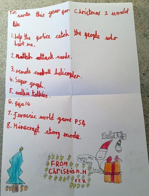参照・画像出典:Daily Mail Online/All I want for Christmas is for the men who shot me to be caught: Seven-year-old boy who was attacked with his mother on their doorstep in tit-for-tat gangland shooting writes heartbreaking letter to Santa
