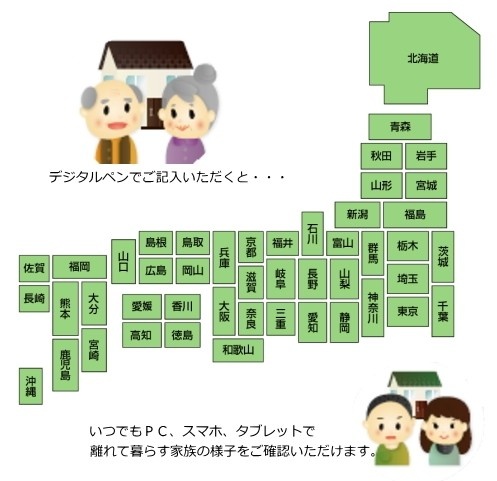 これにより発信者の健康状態、要望、安否を、離れて暮らす家族が、スマホやPC」を通して毎日確認することが可能になる。