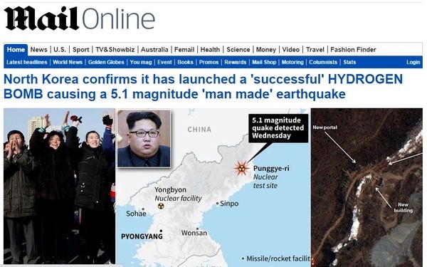 北朝鮮の水爆実験は世界中を震え上がらせているようです。イギリスのニュース誌「DailyMail」もトップニュースで扱うなど今回の動きに注目しているようです。また、実験は成功しているとみており、北朝鮮が水爆を保有したのではないかという不安がよりいっそうたかまってきております。果たして今後どうなっていくのだろうか。