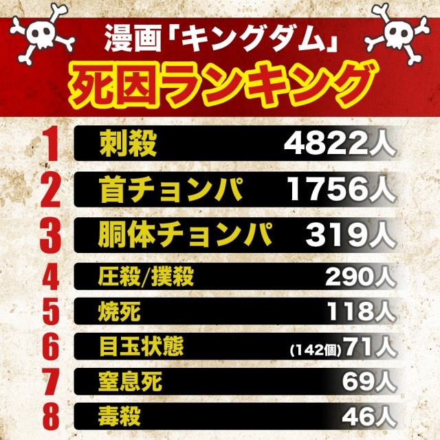 首チョンパの場面は強さをあらわす表現でもあるようで、『キングダム』では首チョンパした数=武将の強さとも言えそうです。