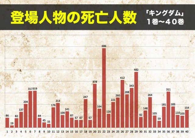 『キングダム』1〜40巻の死亡人数は・・・。