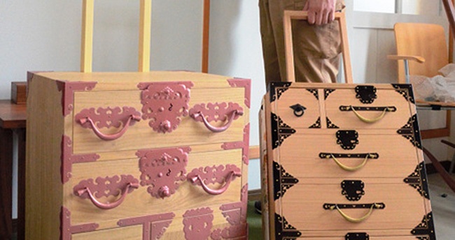 2014年秋に西武福井店で開催されたファッションショー向けのアイテムとして誕生したキャリー箪笥。特徴的な飾り金具は車用の塗料で可愛らしいピンクで、本体の桐材の明るい色とマッチしてます。和風なキャリー箪笥は和服姿にもよく似合いそう。