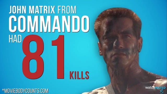 娘のために悪党共を殺しまくる『コマンドー』のジョン・メイトリックスの殺害数は81人。惜しくもランボーにはおよびませんでした。