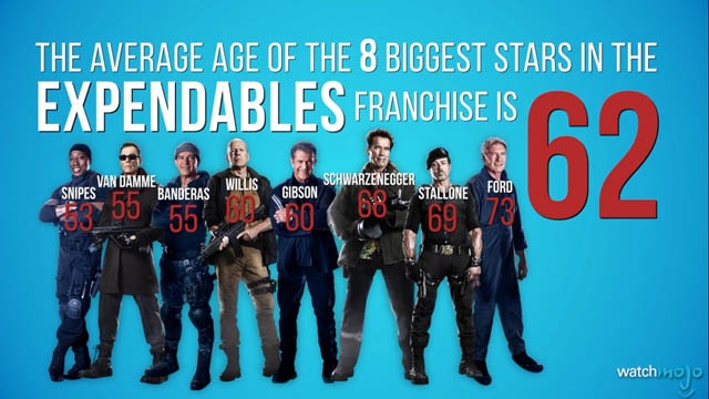 アクションオールスター映画の3作目『エクスペンダブルズ3』に出演したスターたちは、左から順にウィスリー・スナイプス53歳、ジャン・クロード・ヴァンダム55歳、アントニオ・バンデラス55歳、ブルース・ウィリス60歳、メル・ギブソン60歳、アーノルド・シュワルツネッガー68歳、シルヴェスター・スタローン69歳、ハリソン・フォード73歳となります。