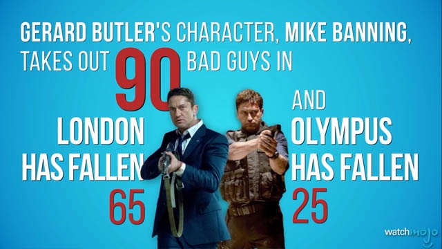 『エンド・オブ・ホワイトハウス』でジェラルド・バトラーが演じる主人公のマイク・バニングは25人を倒し、続編の『エンド・オブ・キングダム』では65人を倒しています。