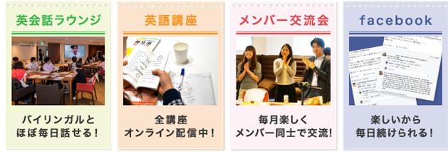 ネイティブ講師と一緒に英語を話す英会話ラウンジ、プロの専門家たちによるユニークな英語講座、ゲストを交えた英語学習者同士の交流会、facebookグループをご用意。オンラインでもオフラインでも英語に楽しく触れ合いながら、英語力のスキルアップにご活用いただけるラウンジサービスです。英会話スクールへ行くよりも楽しくてお得なコンテンツ!