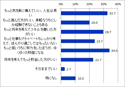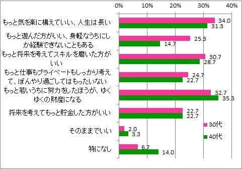 現在「社会人1年目の人」へ、人生の先輩としてアドバイスで一番多かったのは、「もっと若いうちに努力をしたほうが、ゆくゆくの財産になる」で全体の34.0%が回答。年代別で見てみると、30代で一番多かったアドバイスは「もっと気を楽に構えていい、人生は長い」(34.0%)で、40代で一番多かったアドバイスは、「もっと若いうちに努力したほうが、ゆくゆくの財産になる」(35.3%)という結果となった。