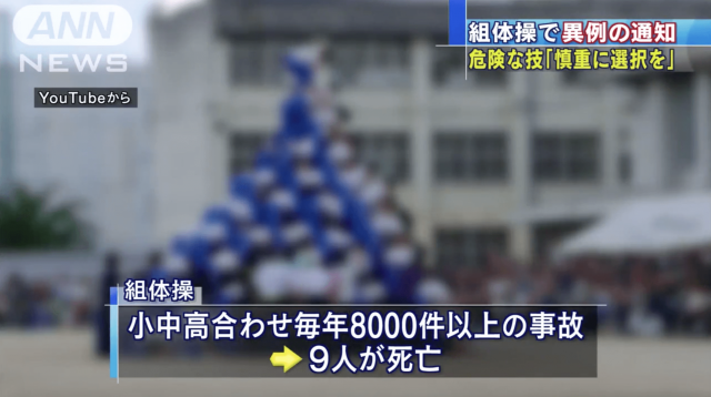 スポーツ庁の分析によると、46年間に学校の組み体操での死亡事故が9件発生していることがわかった。