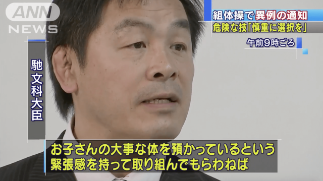 馳文部科学大臣は閣議のあとの記者会見で、「学校や学校長には安全配慮義務という厳しいことばが課されており、組み体操を行うのであれば、お子さんの大事な体を預かっているという緊張感を持って取り組んでもらわねばならないという思いを込めたつもりだ」と述べた。