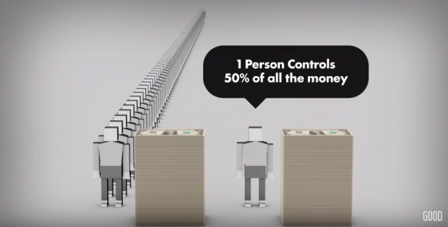富める1人とその他99人の所得が同じ。世界の富の半分は、たった1人の富豪が独占している。貧富の差について、よくw分かる比較だ。