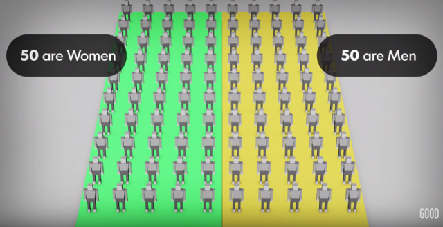 現在の世界の人口は、およそ73億人。人口が100人だとすると、男女比は50人対50人。