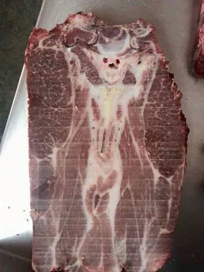 こちらが現在海外で話題となっているステーキ肉。なんとも霜降りでおいしそう・・・いやいやちょっと待て、中に何かいるぞ!デビルならぬ、子デビル的な何か。しかもちゃんと何か武器っぽいものも持っており、RPGに出てきそうな、よくありがちなデビルのようです。
