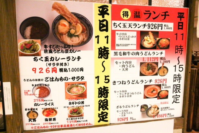 「釜たけうどん」に行くのであれば、平日の11時〜15時がオススメです。この時間帯は平日限定のランチを行っており、お得なセットを注文することができます。