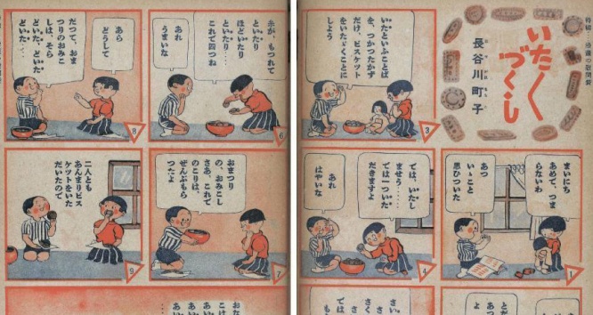 こちらは今回発見された作品のひとつ。1940年の「せうがく三年生」に掲載されたもの。丸坊主とおかっぱという当時の定番ヘアスタイルではありますが、カツオ?ワカメ?とも思えるような子供二人が描かれています。