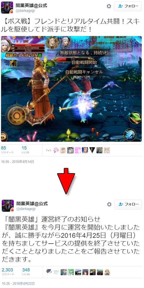 『闇黒英雄』を今月に運営を開始いたしましたが、誠に勝手ながら2016年4月25日(月曜日)を持ちましてサービスの提供を終了させていただくこととなりましたことをご報告させていただきます。— 闇黒英雄@公式 (@darkagejp) 2016年4月22日