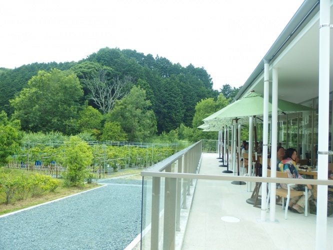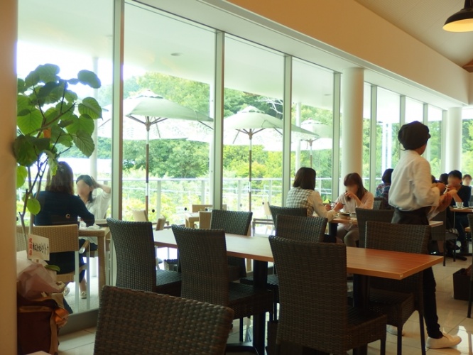 室内の席からも大きなガラスの窓越しに、森林と果樹公園を眺めることができるので、緑に囲まれて、ゆったりリラックスした気分になれます。
