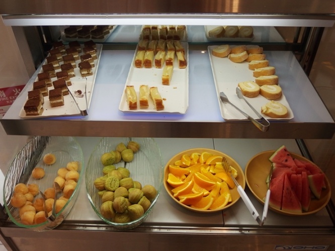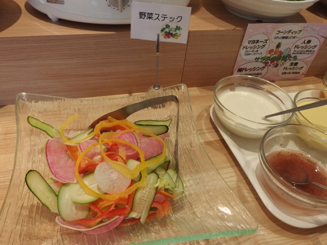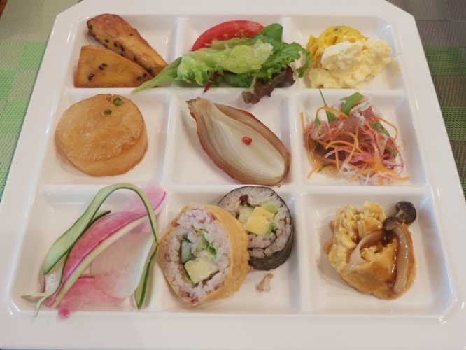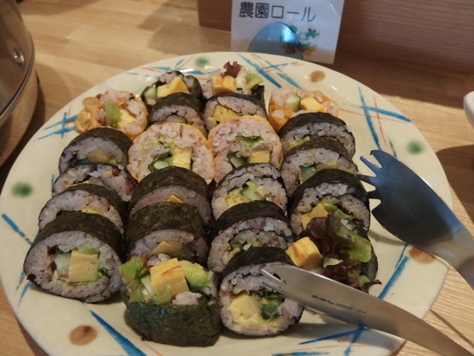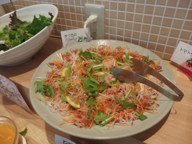 メニューは時期により異なりますが、この日は、明太ポテト、ごぼうとレンコンのスパイシーサラダ、もやしのペペロンチーノ、かぼちゃサラダ、たまごサラダ、青菜の胡麻和え、トマトサラダ、まぐろのカルパッチョ、チキンの柚子みそ焼き、玉ねぎロースト、さつまいもフリット、大根ロースト、オムレツ、農園ロール、野菜スティック、唐揚げ、ピザ、パン数種類、デザート、フルーツ、各種ドリンクが並んでいました。