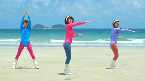 まぶしいカラーのレオタードに身を包んだ女性が3人、砂浜で踊り、歌う。