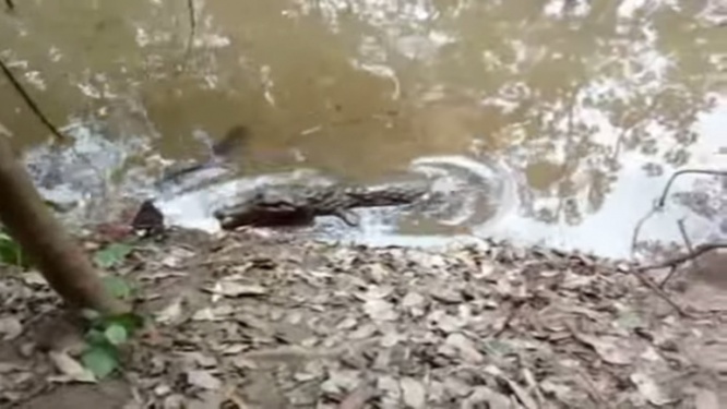 とある川のほとりにて、デンキウナギを襲おうと試みるワニを発見した男性。
