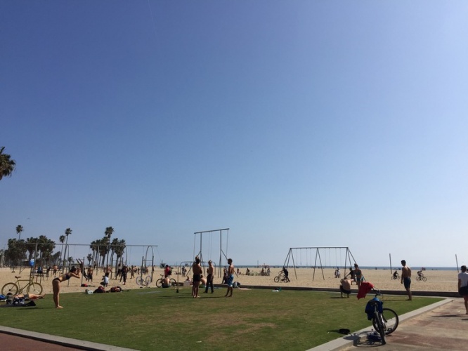 サンタモニカからヴェニスまではさくっと漕いで約1時間。太陽と潮風を感じながら漕ぐ自転車、とにかく最高です。