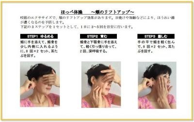 次は、ほおのリフトアップをはかる「ほっぺ体操」。耳たぶやほおを引っ張ったり回したりすることで咬筋のエクササイズをおこない、日焼けや加齢によるほうれい線のくすみを予防する効果がある。これも1日に3~5回おこなう。