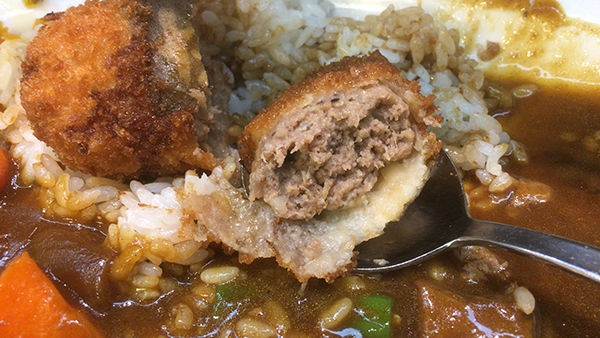 そしてこちらは揚げたてのメンチカツ。店の名前の入ったメンチカツはスプーンで割ると「サクッ」といい音がする。