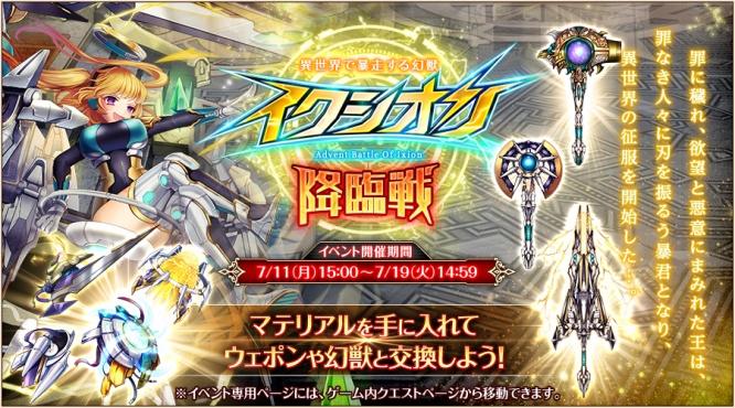 開催期間は7月11日15時から7月19日14時59分までとなっており、イベントに参加することで手に入るマテリアルは、期間限定のウェポンや幻獣と交換することができる。