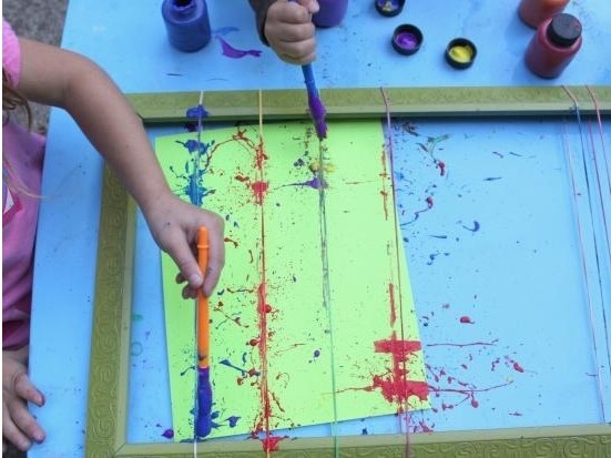 4 フレームに輪ゴムを取り付ければ、子供の絵遊びの道具にもなる。3と同様、ゴムのしなりを利用して様々な柄を描くことができる。
