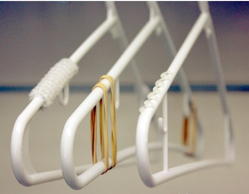 5 ハンガーにこのように輪ゴムをくくりつけてみよう。服をハンガーにかけた際、ハンガーから服がずり落ちないようになる。