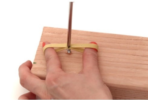 21 スクリューをねじ込むときに、輪ゴムでこのように固定すれば安定させながらねじ込むことができる。