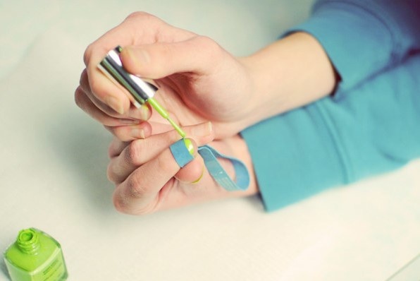 8 少し太目の輪ゴムを指の爪にのせれば、フレンチネイルなどの2色使いのマニキュアがはみ出すことなく簡単に塗れる。