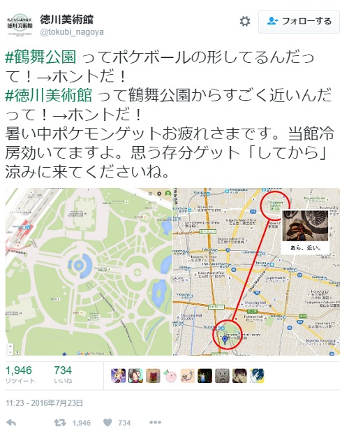 鶴舞公園に集まる『ポケモンGO』ユーザーに目を付けたのが、すぐ近くにある徳川美術館。公式Twitterでは「暑い中ポケモンゲットお疲れさまです。当館冷房効いてますよ。思う存分ゲット「してから」涼みに来てくださいね」と投稿し、『ポケモンGO』ユーザーを歓迎している。