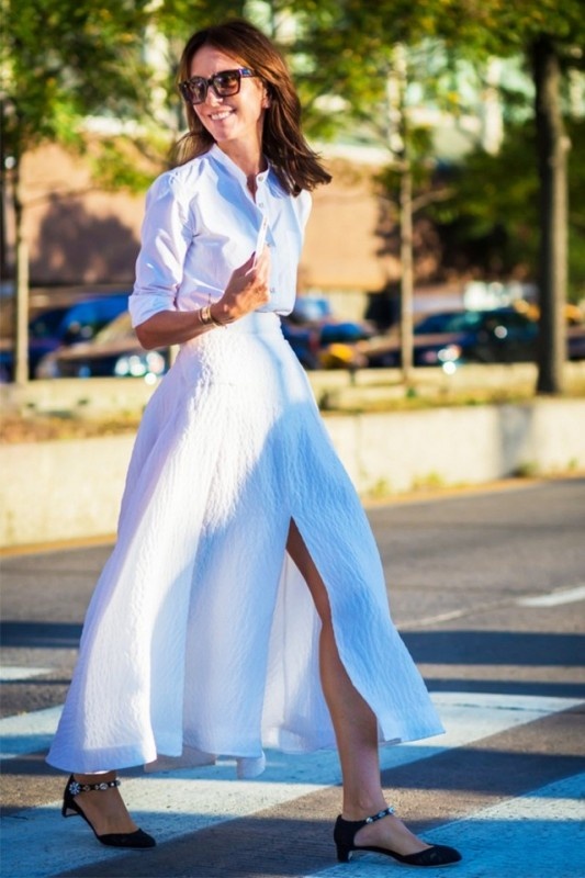 ホワイトシャツにホワイトスカート。とてもシンプルだからこそ、スリットで軽やかさやヌケ感を演出する好機会。