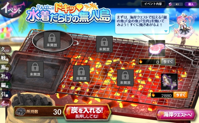 「かんぱに☆ドキッ 水着だらけの無人島」イベントでは、クエストで手に入れたアイテムや素材を特設ページで焼くと色々なアイテムに変化します!焼いたアイテムがイベントハンマーや「銀の受付ポスト」などの人気アイテムに変化することがあります。また、社員たちの夏休みを描いた新シナリオクエストも登場します。