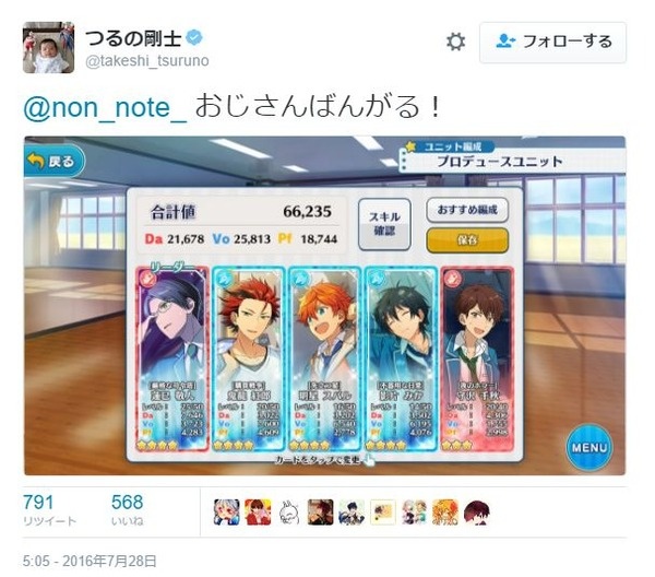 — つるの剛士 (@takeshi_tsuruno) 2016年7月28日@non_note_ おじさんばんがる! pic.twitter.com/ad9p4SHKKf